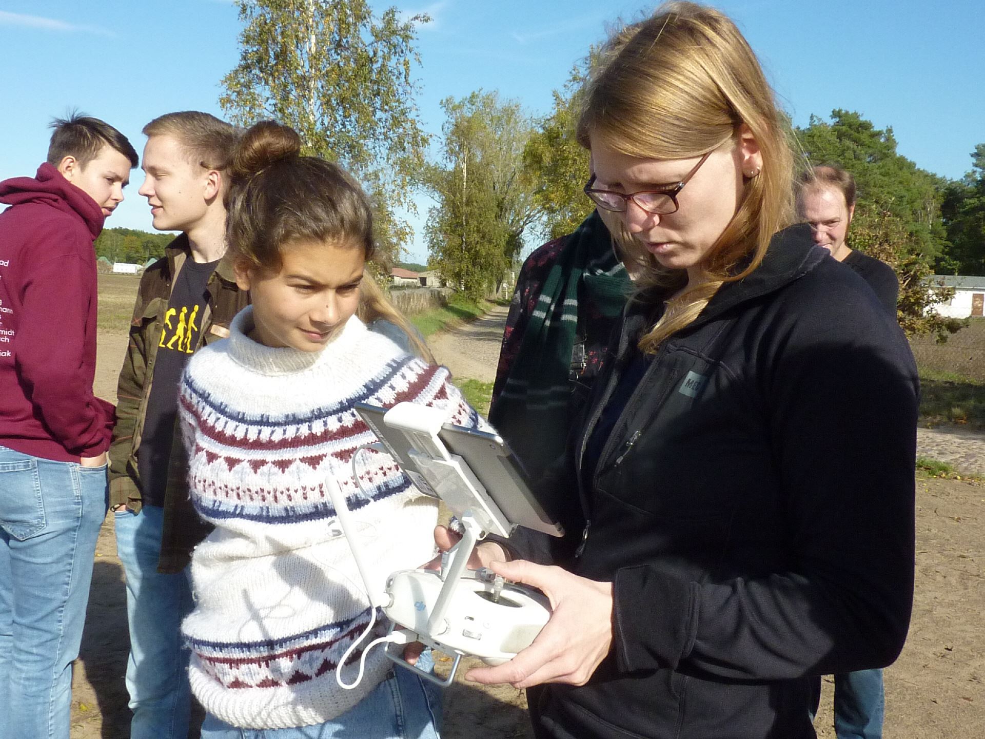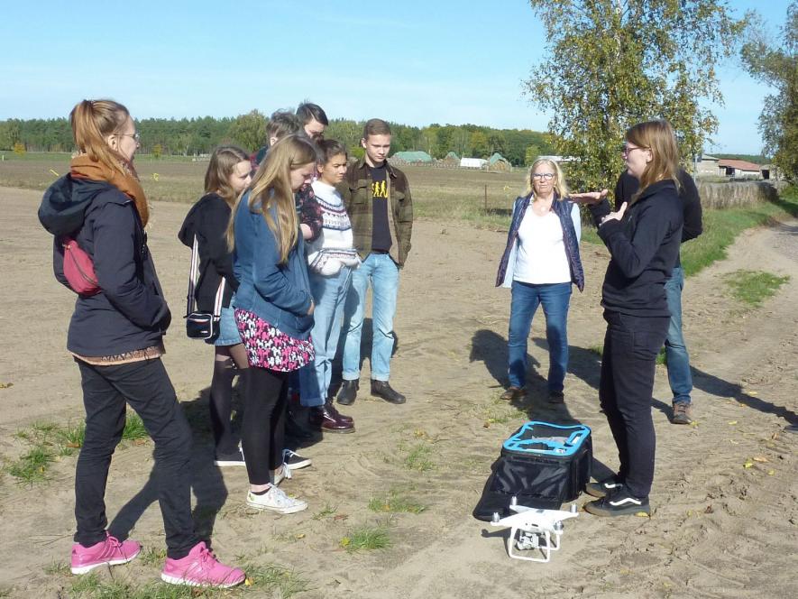 Die Drohne fliegt über ein Feld in der Prignitz. Anne Schindhelm vom Geoforschungszentrum Potsdam steuert sie. Unten am Boden verfolgen Jugendliche aus Brandenburg, u.a. aus Neuruppin, Brück und Potsdam die fliegende Kamera und die Informationen von Dr. Jörg Müller von der Sielmann Stiftung. Die beiden Biologen arbeiten gemeinsam am NaTec (Natur und Technik) Projekt in der Kyritz-Ruppiner-Heide. Sie erkunden aus der Luft - auch per Flugzeug und Satellit - wie sich die Heide im Nordwesten Brandenburgs entwickelt.